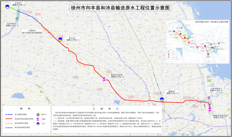 徐州向丰县和沛县输送原水工程建设项目发表时间:2025-04-07 10:12 项目名称:徐州向丰县和沛县输送原水工程建设项目 建设单位:徐州市新水国有资产经营有限责任公司 审计单位:江苏华社工程管理咨询有限公司 项目地址:徐州市铜山区、沛县、丰县。 项目规模:8.4亿 项目简介:①利用小沿河北取水口及其至小沿河北取水泵站段的现有箱涵及倒虹管,改造取水泵站,输水规模30万吨/天。②新建2根从取水泵站至规划郑集水厂管道,管径DN1400,长度16.2公里(双管32.4公里);新建从规划水厂经增压泵站至河口镇区管道2根,其中一根管径DN1400,另一根管径DN1200,各28.25公里;新建至丰县梁满路管道2根,管径DN1000,长度6.05公里(双管12.1公里)。③新建增压泵站1座,位于S322徐丰公路南侧、沛敬线西侧和新安集大沟北侧之间地块,原水输送规模25万吨/天。