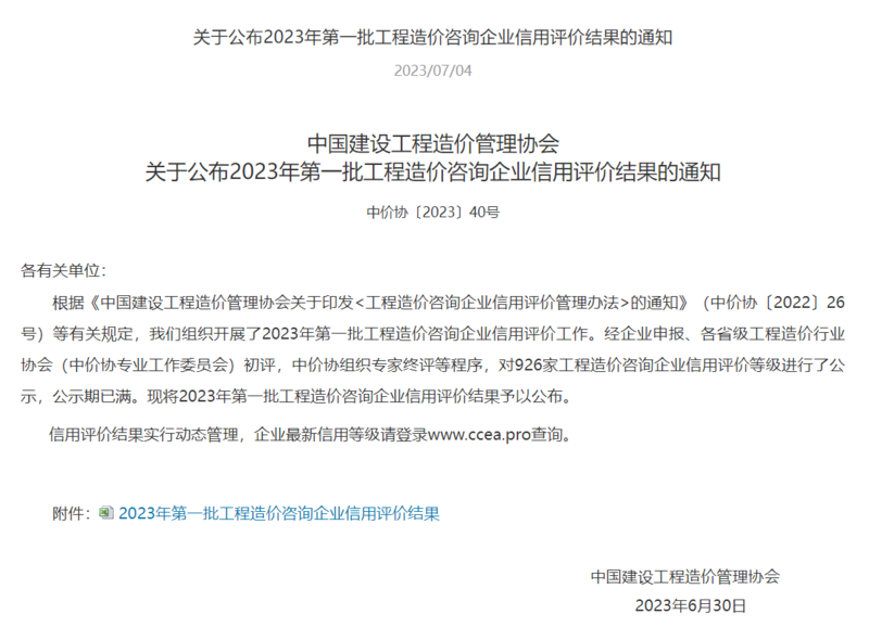 工程造价咨询企业信用等级由中国建设工程造价管理协会根据《中国建设工程造价管理协会关于印发<工程造价咨询企业信用评价管理办法>的通知》等有关规定,通过对企业的基本情况、经营能力、管理能力、教育培训、信息化、成果质量、社会评价、文化建设与社会责任等方面进行综合评价并最终确定。共分为“AAA、AA、A、B、C”三等五级,“AAA级”为最高等级,是企业实力及行业信誉的综合体现。本次评选全国共有786家企业获评“AAA级”,江苏省仅26家获评。