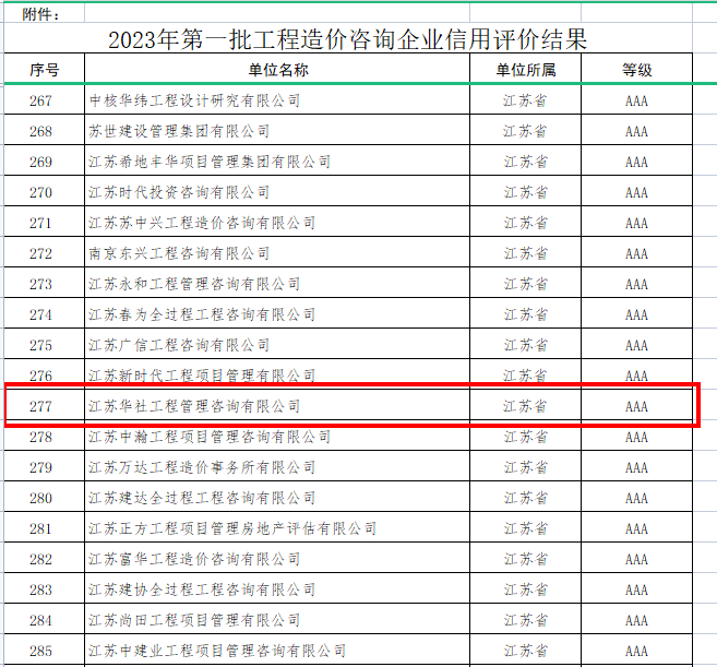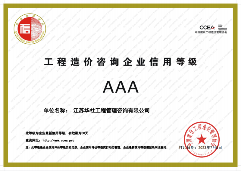 华社News | 华社咨询获评中价协“工程造价咨询企业信用评价AAA级”发表时间:2023-07-06 09:23 近日,中国建设工程造价管理协会公示了2023年第一批工程造价咨询企业信用评价结果。经企业申报、各省级工程造价行业协会(中价协专业工作委员会)初评、中价协组织专家终评等程序。江苏华社工程管理咨询有限公司获评中价协工程造价咨询企业信用评价最高等级AAA级!为公司更好地服务客户、持续经营提供了强有力的资信保障。
