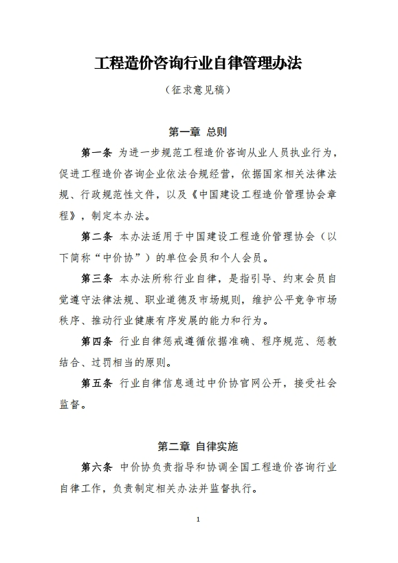为进一步完善工程造价咨询行业自律体系建设,规范工程造价咨询行业从业行为,我协会组织编制了《工程造价咨询行业自律管理办法》,现公开征求意见。